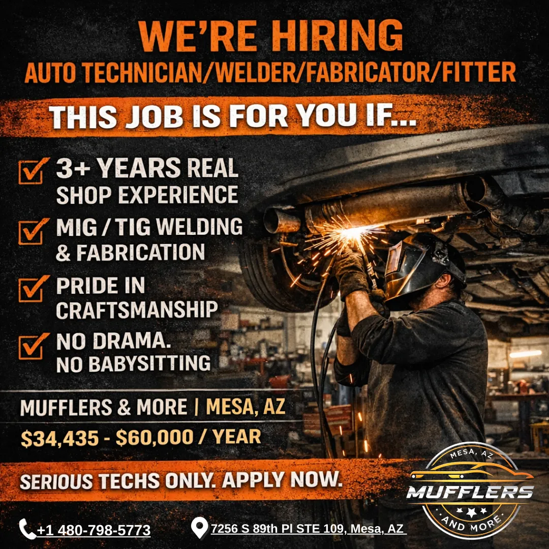 Mufflers & More is a busy, fast-growing custom exhaust and general repair shop in Mesa, AZ with 750+ five-star reviews—and we’re building a team of professionals, not bodies.